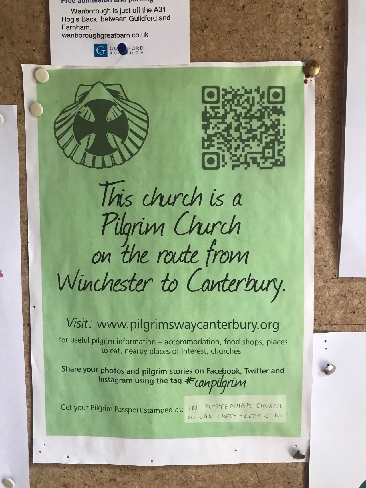 After leaving the canal, I had a chicken salad for lunch at The Greyhound pub in Ash, Surrey (my fourth county on this walk). The Scottish barman was friendly and wanted to hear my “Canterbury Tale.” It’s funny that in Ash, the idea of a pilgrim to Canterbury seems exotic, whereas here in Puttenham it’s a well known thing. The Norman church has a stamp for pilgrims to put in their credentials, and the camping barn has a map of the route from Winchester to Canterbury on the wall.
