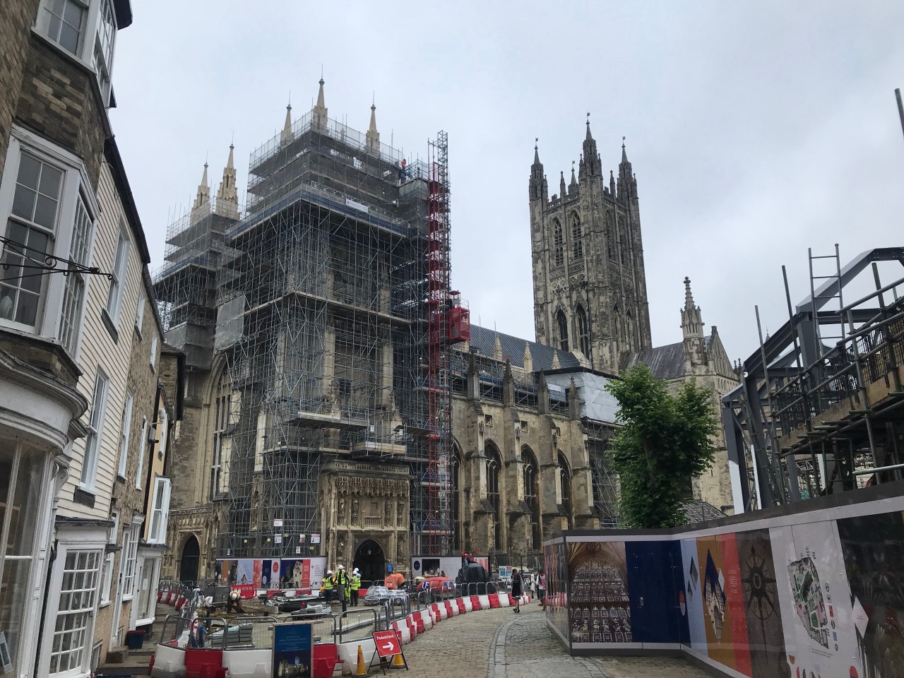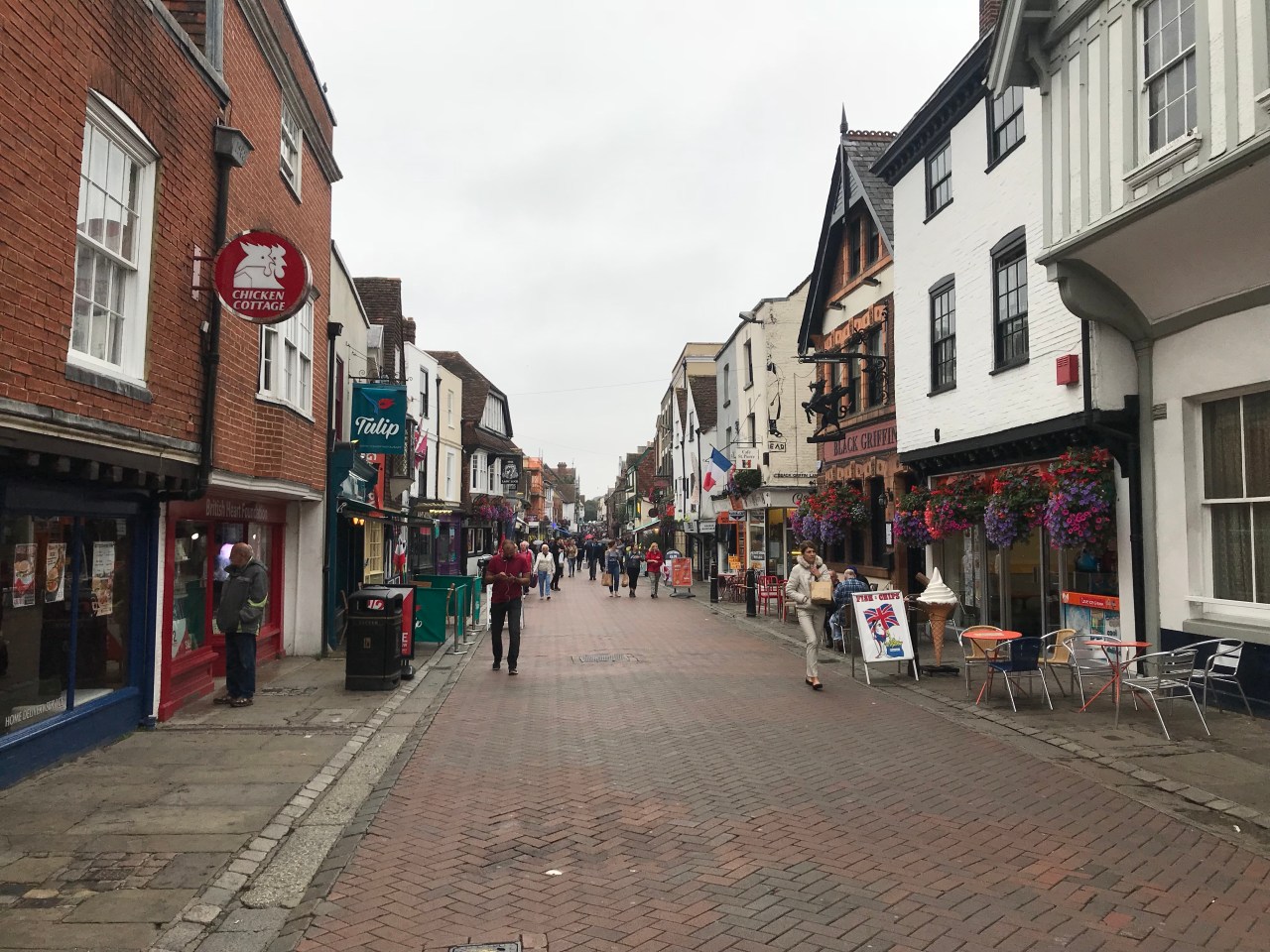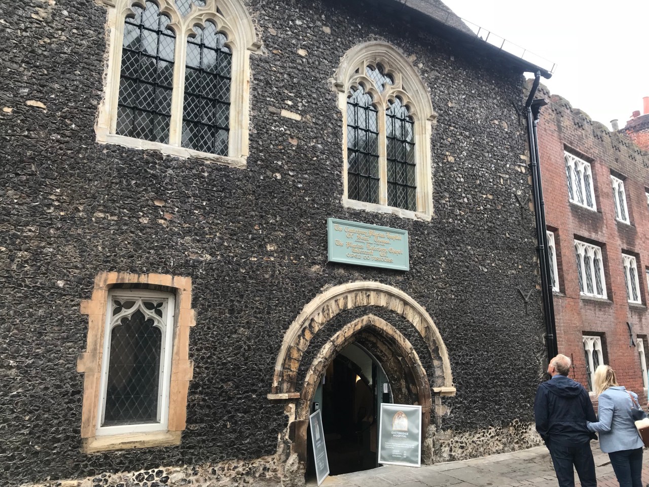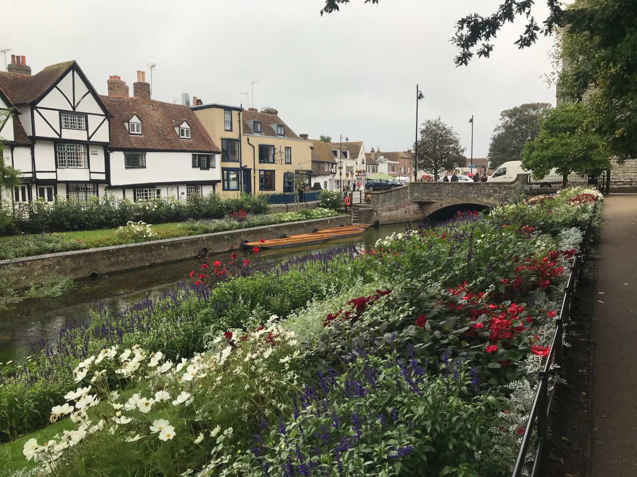 I soon arrived in suburban Canterbury; the brick houses looking much those around any English town, except for the Cathedral tower that kept appearing between the rooftops. I walked through the Franciscan Gardens, past the city walls and the city’s West gate, through which countless pilgrims have passed over the centuries. Today, pedestrians walk around it and only cars go through. From there, I entered the crowded St. Peter’s Street and High Street. I passed museums, kiosks selling punt trips, restaurants, and the historic pilgrim hospital. At the statue of Geoffrey Chaucer, 14th Century author of The Canterbury Tales, tour guides point out that one of the figures around the base was modelled after the movie idol Orlando Bloom, a son of the city. It’s a cheap gimmick to keep teenage language students interested, but Chaucer was just as bad; sexing up his stories with bawdy bits.