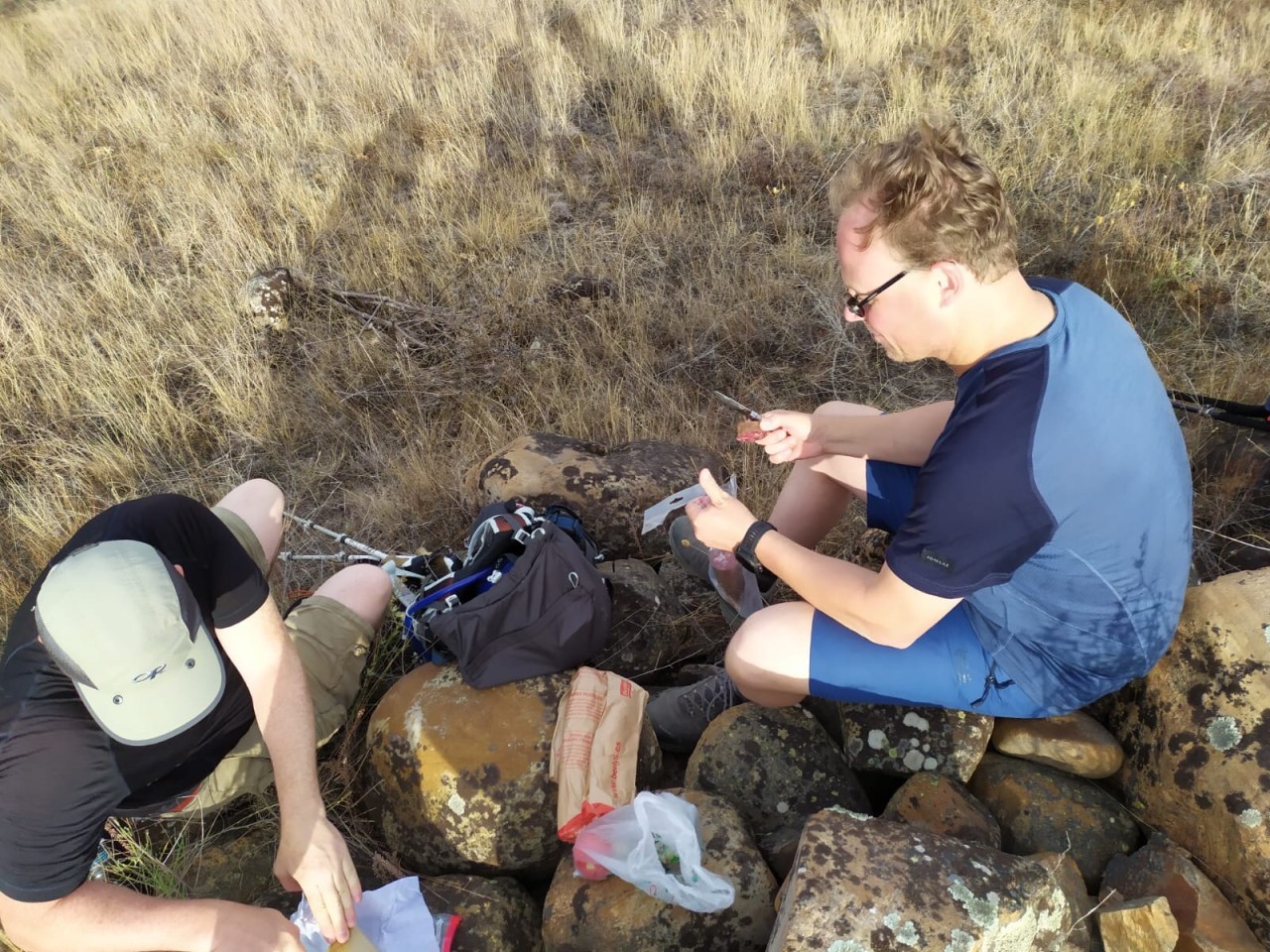 She passed us again as we took a break near the ruins of the castle town of Castrotorafe. As we enjoyed our bread, cheese, sausage, and pickles, Michael spotted a well camouflaged praying mantis in the grass.